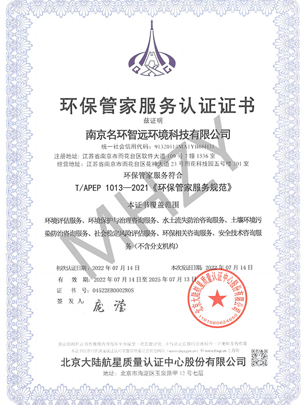 南京名環(huán)智遠(yuǎn)環(huán)境科技有限公司 南京名環(huán)智遠(yuǎn)環(huán)境科技有限公司定位為專業(yè)生態(tài)環(huán)境技術(shù)服務(wù)提供商,基于先進(jìn)的生態(tài)與環(huán)境保護(hù)技術(shù)研發(fā)、應(yīng)用和綜合服務(wù)能力,為客戶提供生態(tài)與環(huán)境保護(hù)領(lǐng)域的管理與技術(shù)咨詢服務(wù)、環(huán)境工程全流程綜合解決方案以及環(huán)保高新技術(shù)成果轉(zhuǎn)化與產(chǎn)業(yè)化運(yùn)作,致力于為政府、園區(qū)和企業(yè)提供生態(tài)保護(hù)與污染防治“全過程”、“全方位”、“全覆蓋”的一站式綜合服務(wù)。公司目前是中國環(huán)境保護(hù)產(chǎn)業(yè)協(xié)會(huì)、中國環(huán)境科學(xué)學(xué)會(huì)、江蘇省環(huán)境保護(hù)產(chǎn)業(yè)協(xié)會(huì)、江蘇省環(huán)境科學(xué)學(xué)會(huì)土壤和地下水修復(fù)專業(yè)委員會(huì)、江蘇省水土保持學(xué)會(huì)、南京市環(huán)境保護(hù)產(chǎn)業(yè)協(xié)會(huì)等協(xié)會(huì)理事和南京市政法委重大決策社會(huì)穩(wěn)定性評估機(jī)構(gòu)。公司目前已取得若干專利,通過了質(zhì)量、環(huán)境和職業(yè)健康管理體系認(rèn)證和高新技術(shù)企業(yè)認(rèn)定,在技術(shù)研發(fā)、業(yè)務(wù)實(shí)踐應(yīng)用等方面形成了雄厚的積累。 公司作為“政府環(huán)保智庫、園區(qū)環(huán)保顧問、企業(yè)環(huán)保管家”,南京名環(huán)智遠(yuǎn)為各級政府、園區(qū)、3000余家企業(yè)提供了污染防治與生態(tài)保護(hù)綜合服務(wù)和解決方案,具體包括水污染治理、大氣污染治理、土壤修復(fù)、固體廢物處置、環(huán)境影響評價(jià)、節(jié)能評估、可行性研究、環(huán)境規(guī)劃、環(huán)保驗(yàn)收、清潔生產(chǎn)、危廢鑒別等。